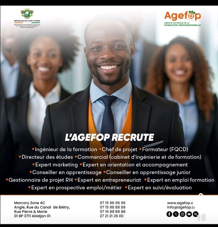 📧 Envoyez votre CV, lettre de motivation et documents pertinents à : info@agefop.ci