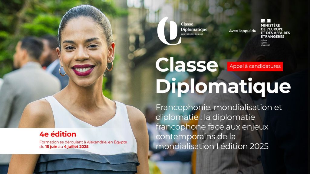 L’Université Senghor lance un appel à candidatures pour une classe diplomatique organisée sur le thème « Diplomatie, mondialisation et Francophonie : la diplomatie francophone face aux nouveaux enjeux de la mondialisation », à l’endroit de 80 jeunes diplomates de l’espace francophone, avec trois objectifs :
