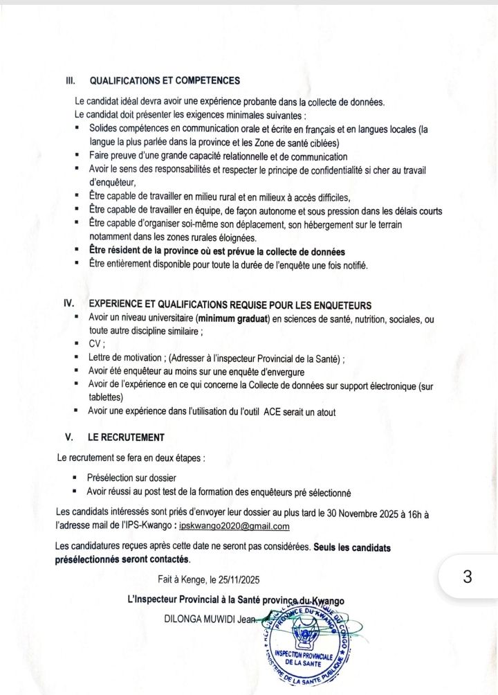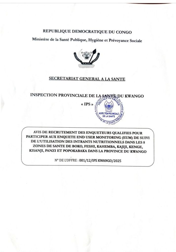 L’Inspection Provinciale de la Santé (IPS) du Kwango lance un avis de recrutement d’Enquêteurs Qualifiés pour participer à l’enquête End User Monitoring (EUM).