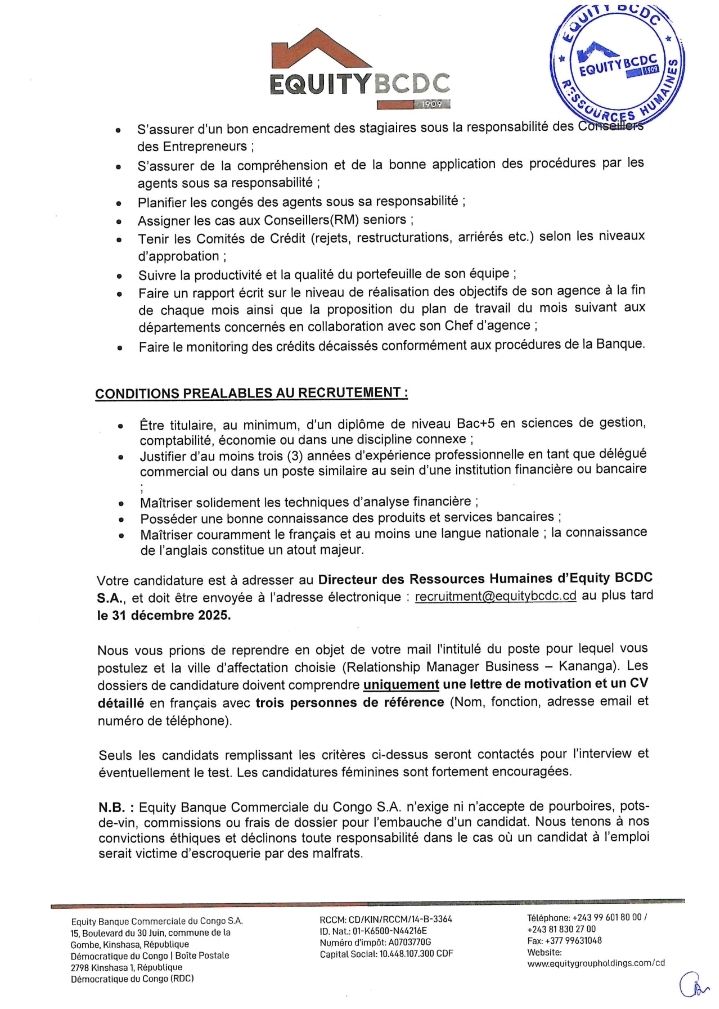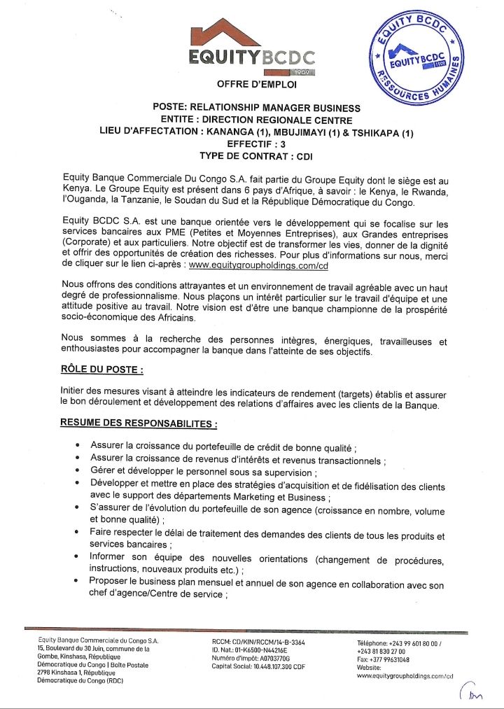 • Lieu : Kananga 1, Mbuji-Mayi 1, Tshikapa 1 • Effectif : 3